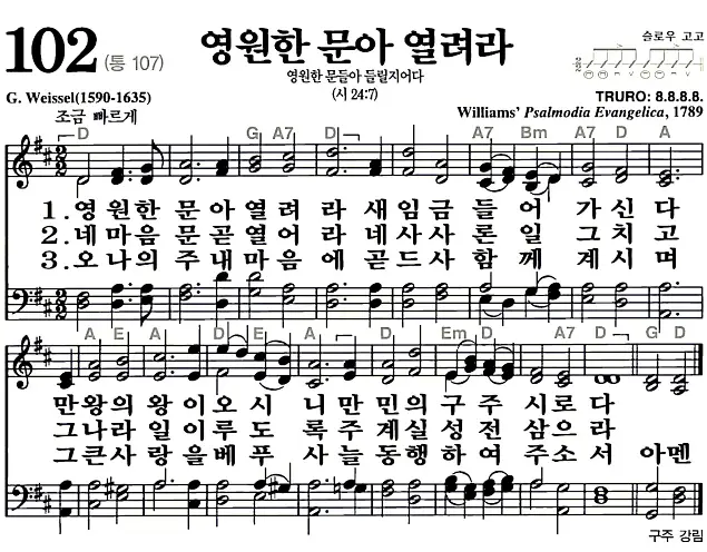 새찬송가 악보: 102장 영원한 문아 열려라(고화질/가사)