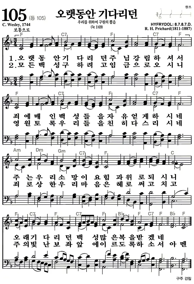 새찬송가 악보: 105장 오랫동안 기다리던(고화질/가사)