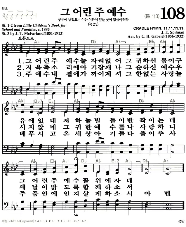 새찬송가 악보: 108장 그 어린 주 예수(고화질/가사)