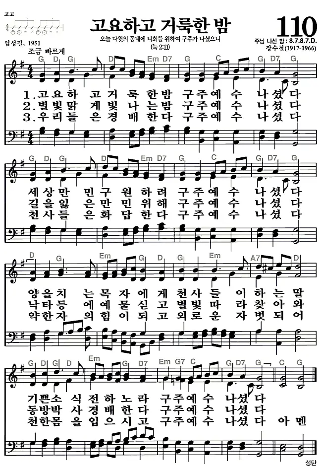새찬송가 악보: 110장 고요하고 거룩한 밤(고화질/가사)