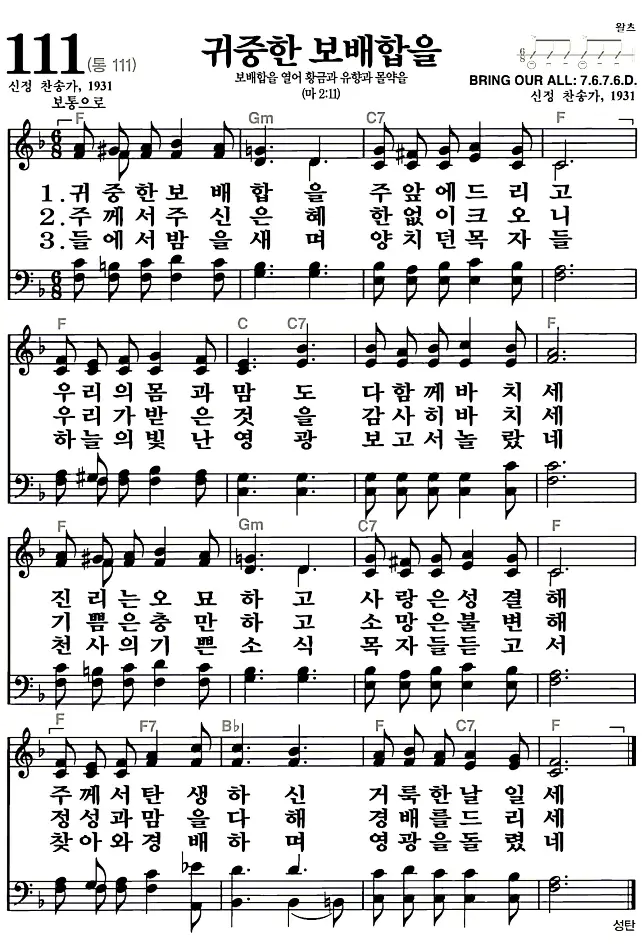 새찬송가 111장 귀중한 보배합을의 고화질로 스캔된 새찬송가 악보입니다.