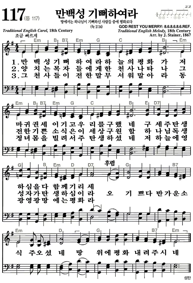 새찬송가 117장 만백성 기뻐하여라의 고화질로 스캔된 새찬송가 악보입니다.