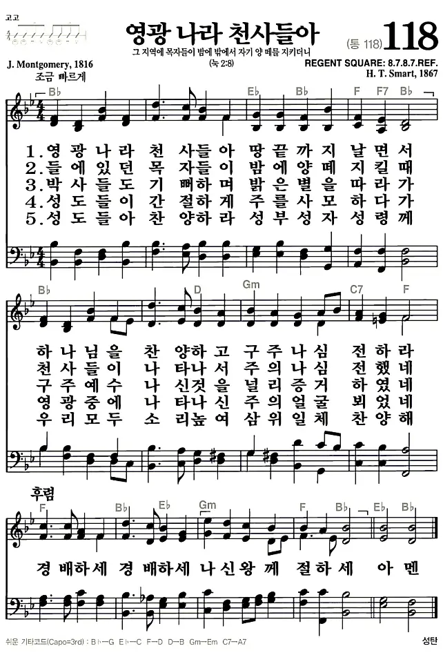 새찬송가 악보: 118장 영광 나라 천사들아(고화질/가사)