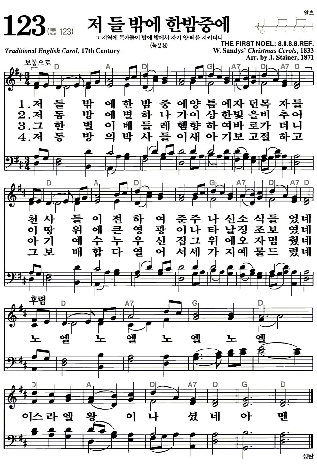 새찬송가 악보: 123장 저 들 밖에 한밤중에(고화질/가사)