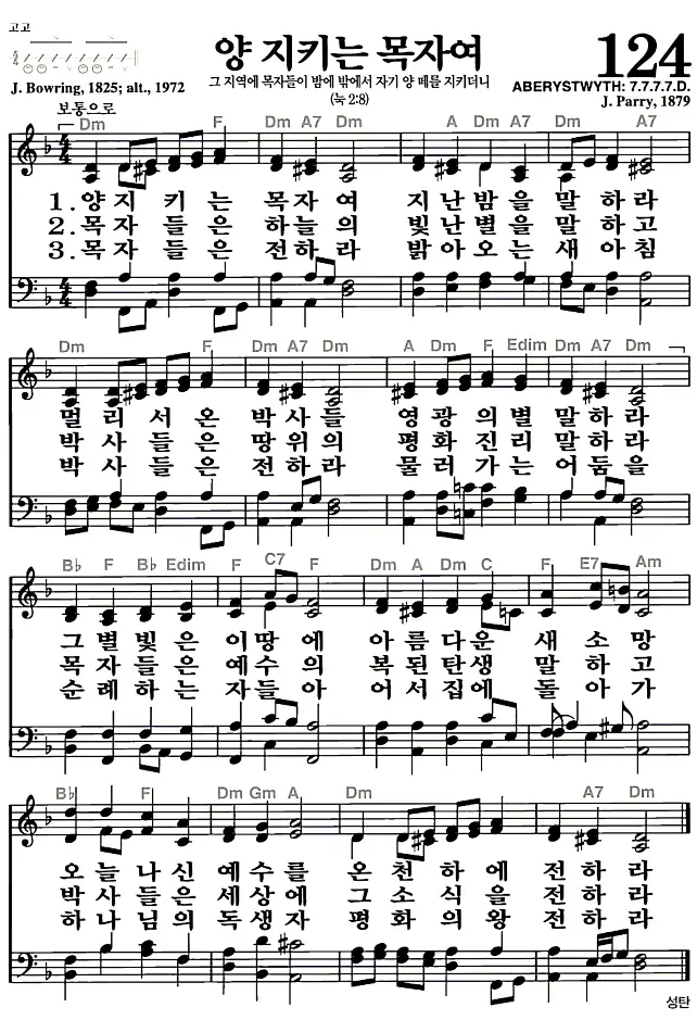 새찬송가 악보: 124장 양 지키는 목자여(고화질/가사)