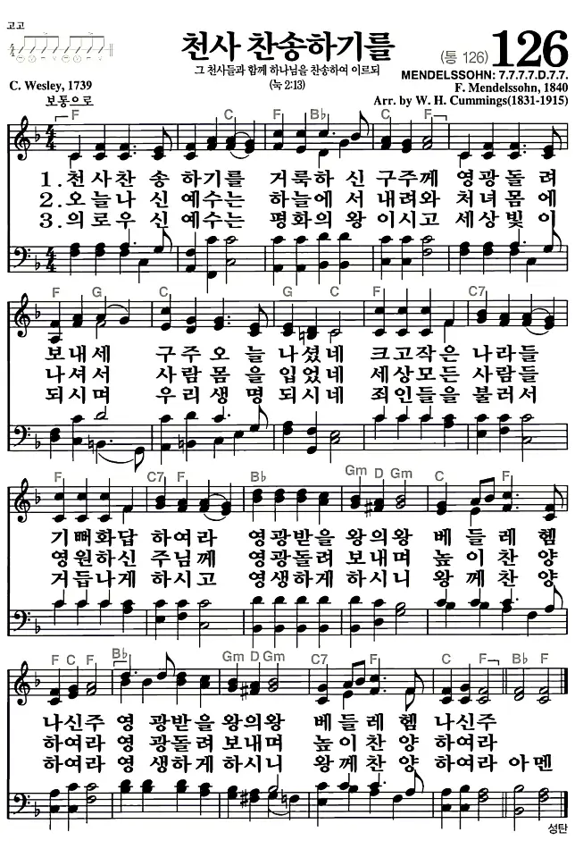 새찬송가 악보: 126장 천사 찬송하기를(고화질/가사)