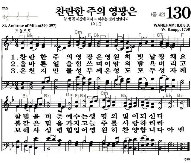 새찬송가 악보: 130장 찬란한 주의 영광은(고화질/가사)
