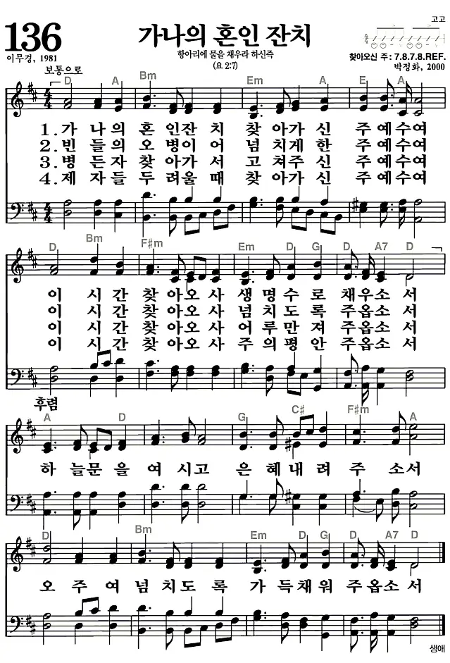 새찬송가 악보: 136장 가나의 혼인 잔치(고화질/가사)