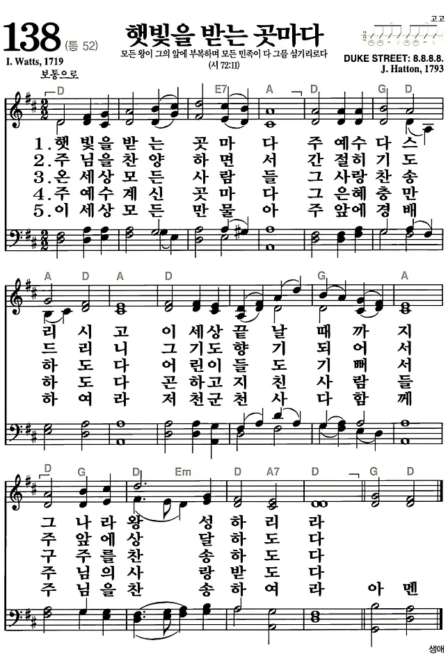 새찬송가 악보: 138장 햇빛을 받는 곳마다(고화질/가사)