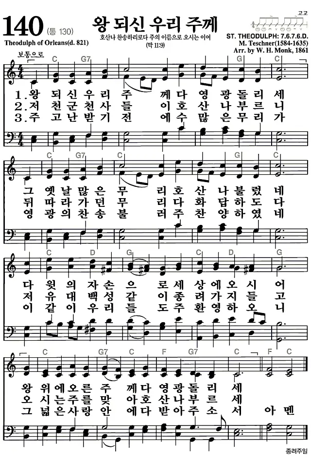 새찬송가 악보: 140장 왕 되신 우리 주께(고화질/가사)