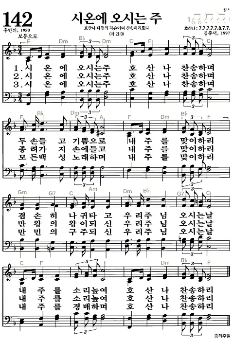 새찬송가 악보: 142장 시온에 오시는 주(고화질/가사)