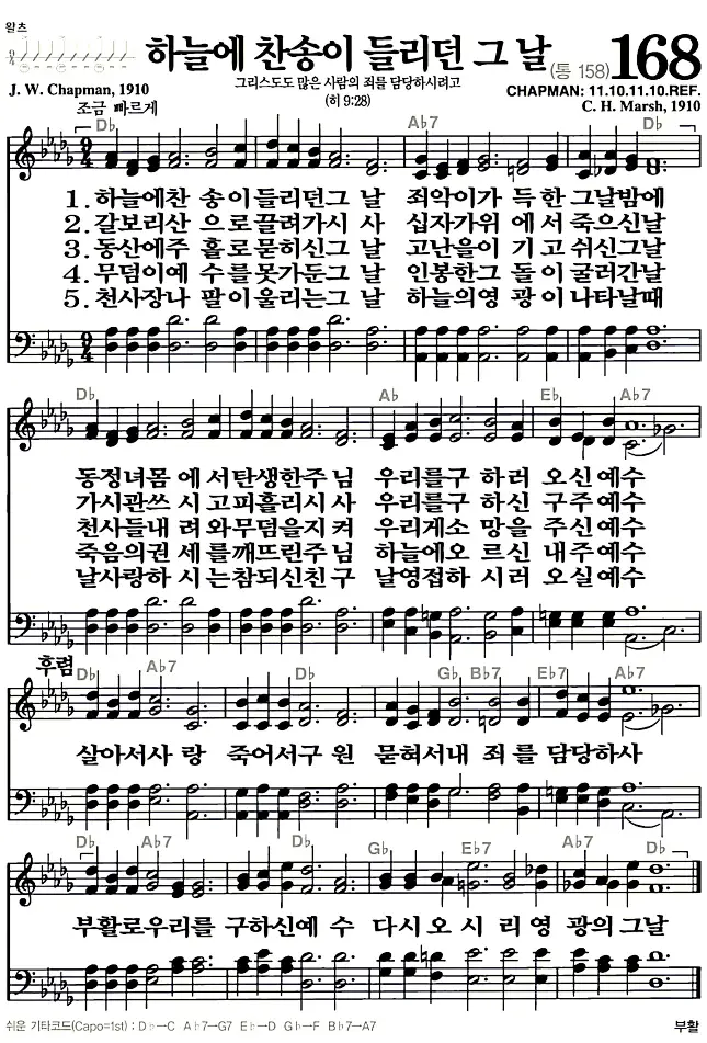 새찬송가 악보: 168장 하늘에 찬송이 들리던 그 날(고화질/가사)