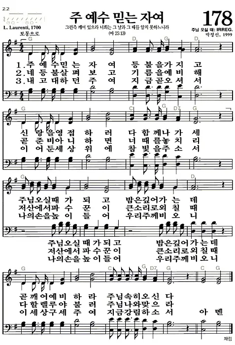 새찬송가 악보: 178장 주 예수 믿는 자여(고화질/가사)