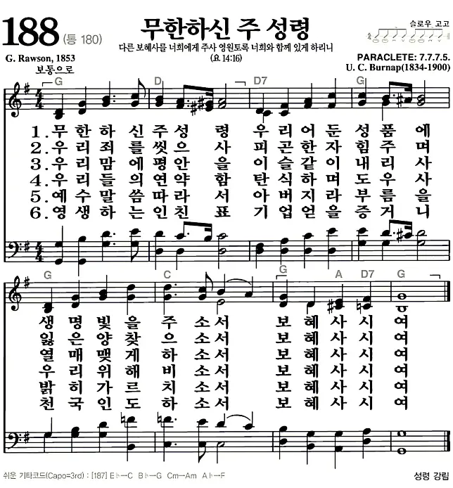 새찬송가 악보: 188장 무한하신 주 성령(고화질/가사)