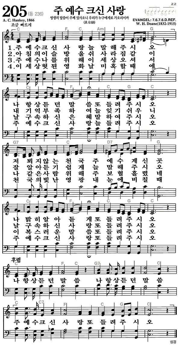 새찬송가 악보: 205장 주 예수 크신 사랑(고화질/가사)