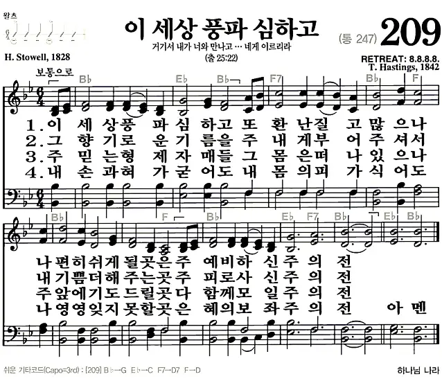 새찬송가 악보: 209장 이 세상 풍파 심하고(고화질/가사)