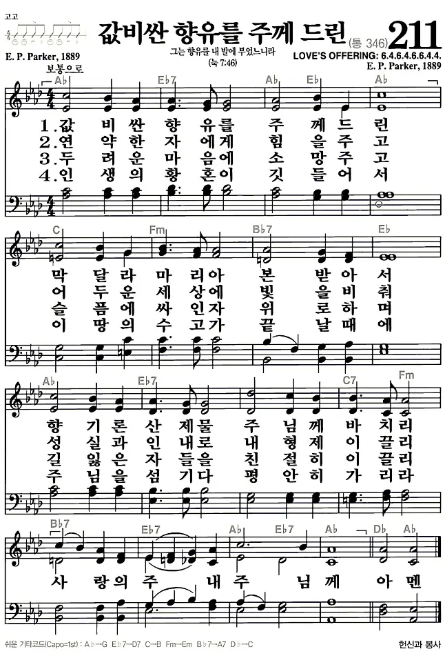 새찬송가 악보: 211장 값비싼 향유를 주께 드린(고화질/가사)