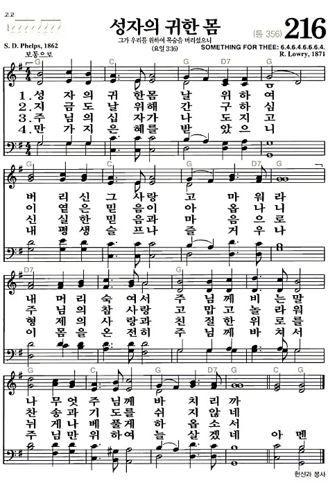 새찬송가 악보: 216장 성자의 귀한 몸(고화질/가사)