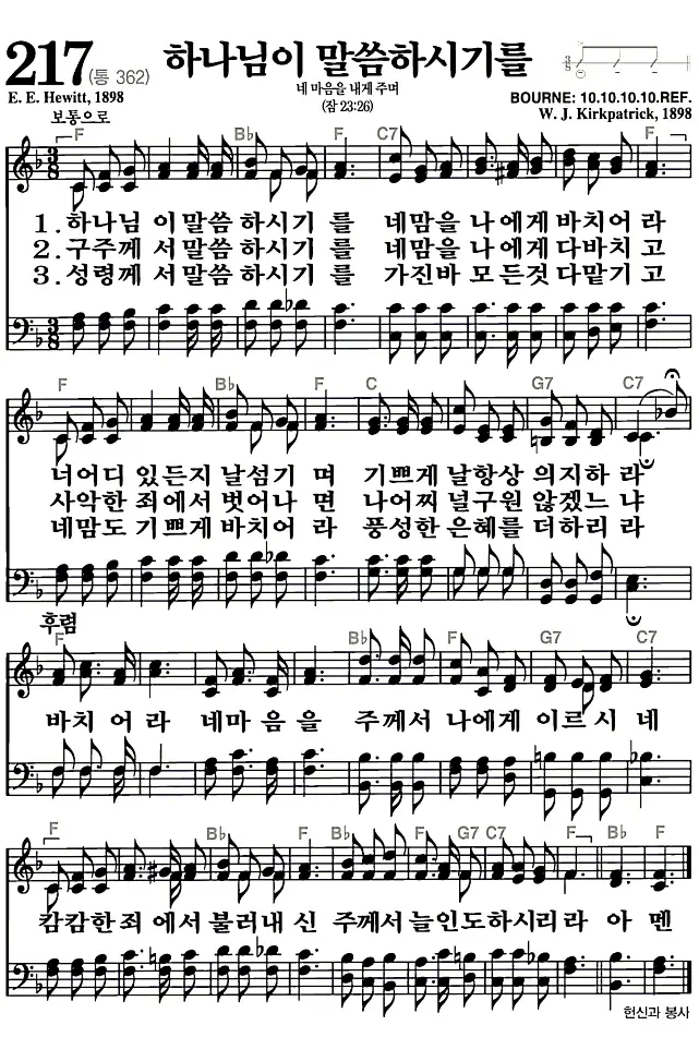새찬송가 악보: 217장 하나님이 말씀하시기를(고화질/가사)