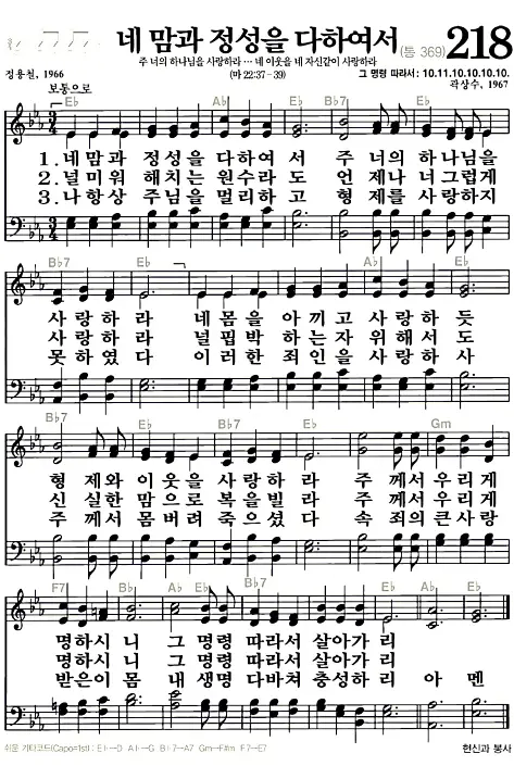 새찬송가 악보: 218장 네 맘과 정성을 다하여서(고화질/가사)