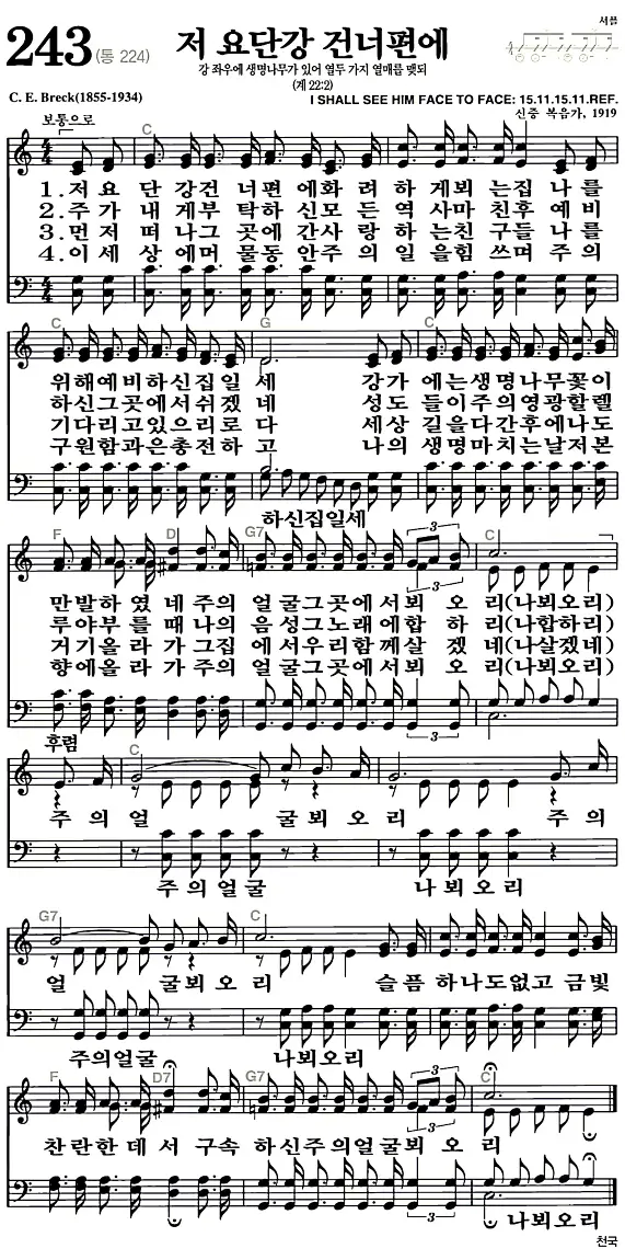 새찬송가 악보: 243장 저 요단강 건너편에(고화질/가사)