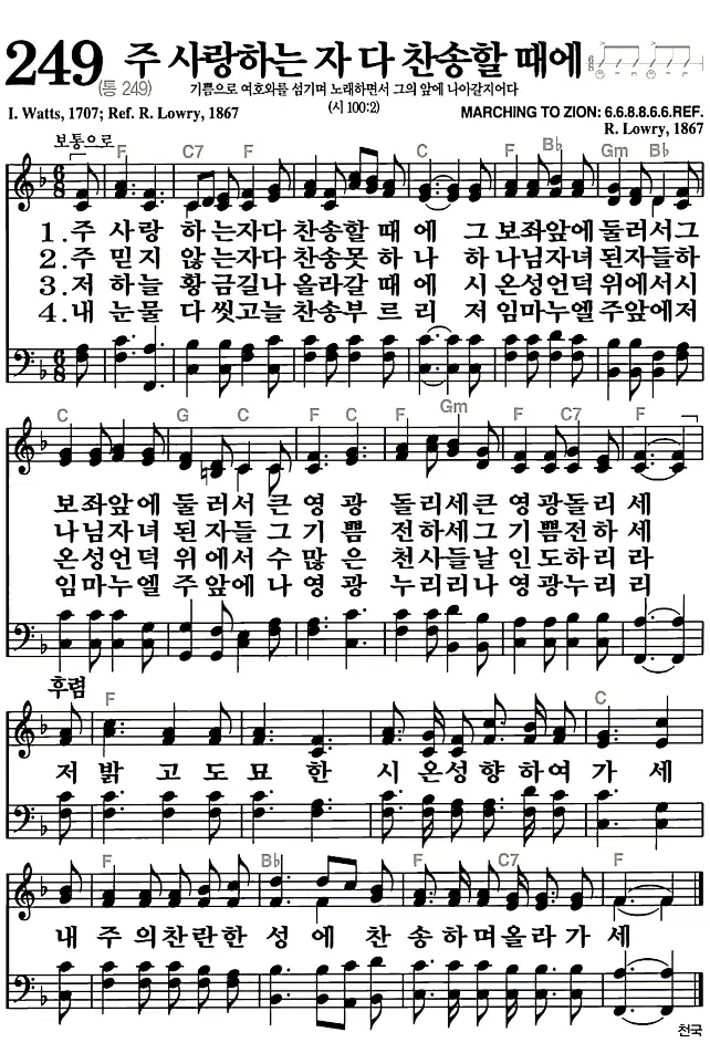 새찬송가 악보: 249장 주 사랑하는 자 다 찬송할 때에(고화질/가사)