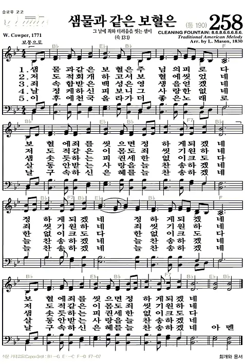 새찬송가 악보: 258장 샘물과 같은 보혈은(고화질/가사)
