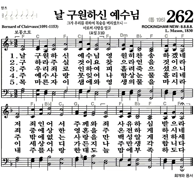 새찬송가 악보: 262장 날 구원하신 예수님(고화질/가사)