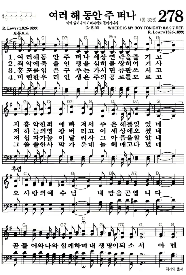새찬송가 악보: 278장 여러 해 동안 주 떠나(고화질/가사)