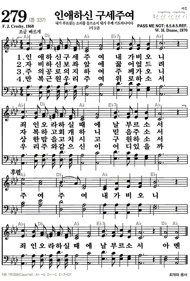 새찬송가 악보: 279장 인애하신 구세주여(고화질/가사)