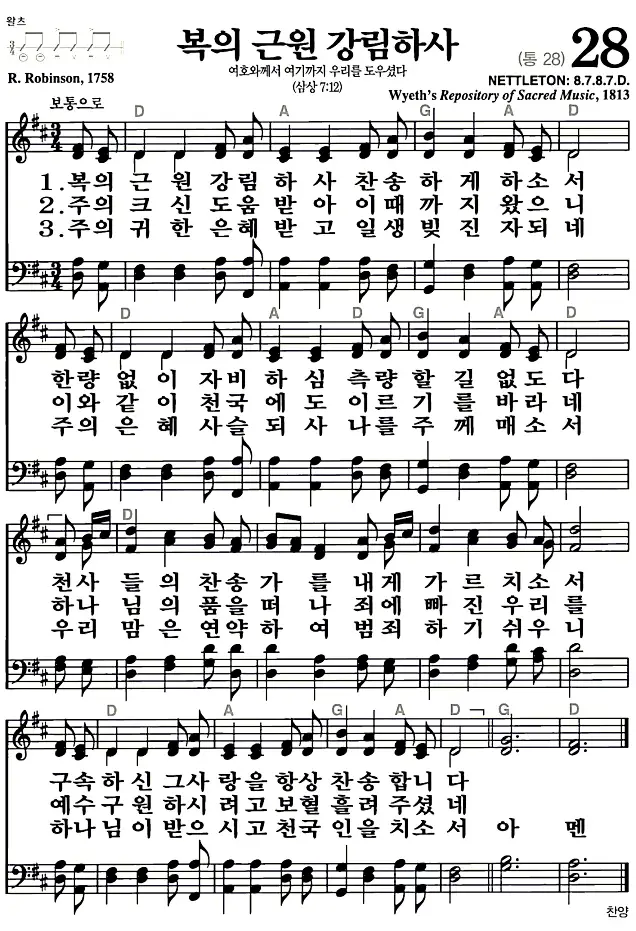 새찬송가 28장 복의 근원 강림하사의 고화질로 스캔된 새찬송가 악보입니다.