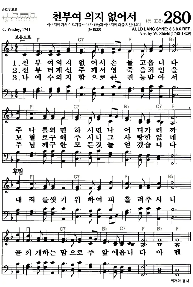 새찬송가 악보: 280장 천부여 의지 없어서(고화질/가사)