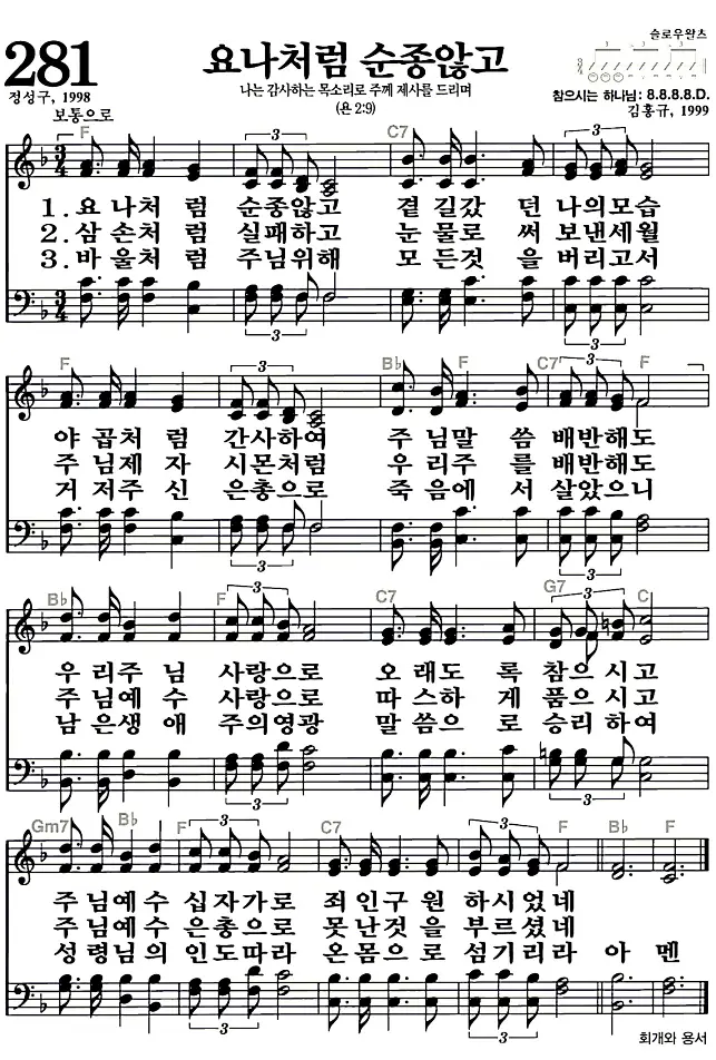 새찬송가 281장 요나처럼 순종않고의 고화질로 스캔된 새찬송가 악보입니다.
