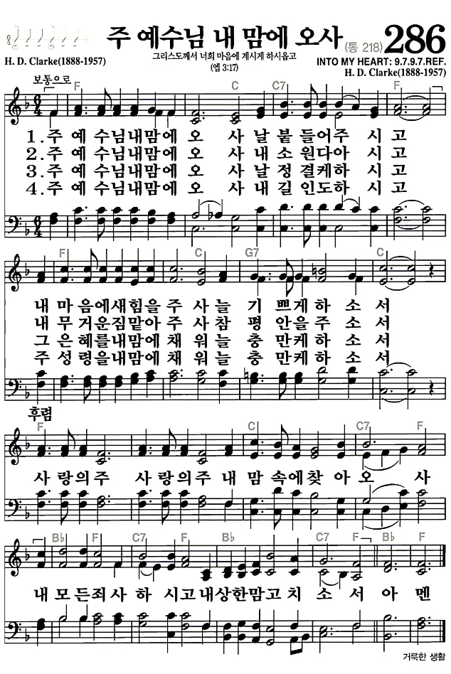 새찬송가 286장 주 예수님 내 맘에 오사의 고화질로 스캔된 새찬송가 악보입니다.