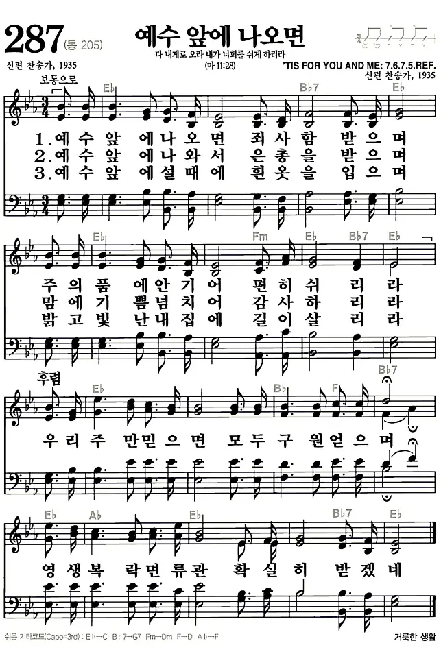 새찬송가 악보: 287장 예수 앞에 나오면(고화질/가사)