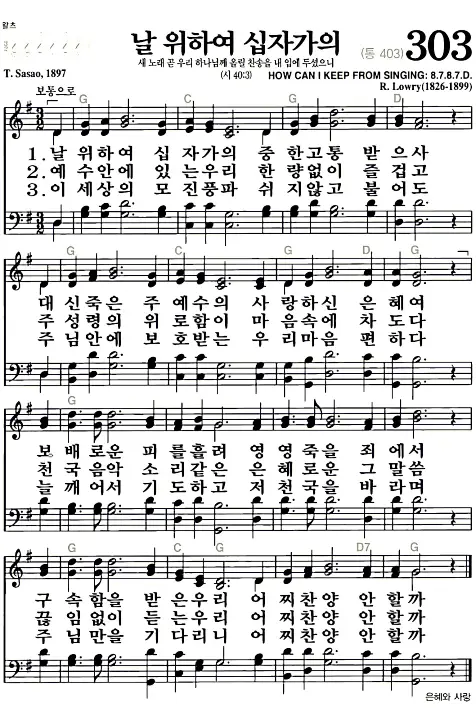 새찬송가 악보: 303장 날 위하여 십자가의(고화질/가사)