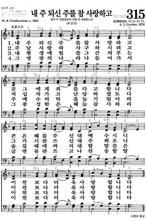 새찬송가 악보: 315장 내 주 되신 주를 참 사랑하고(고화질/가사)