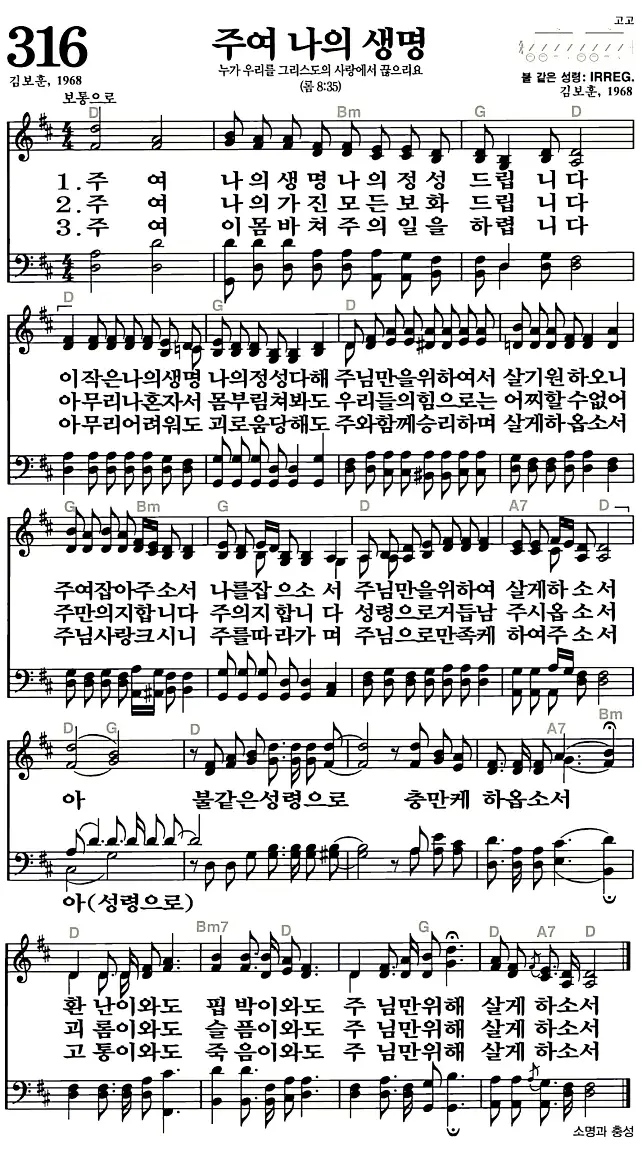 새찬송가 악보: 316장 주여 나의 생명(고화질/가사)