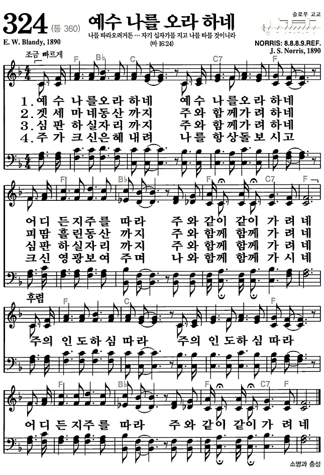 새찬송가 악보: 324장 예수 나를 오라 하네(고화질/가사)