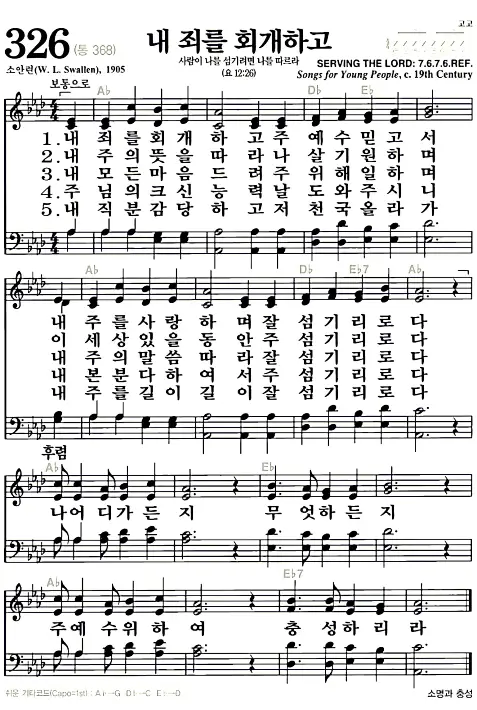 새찬송가 악보: 326장 내 죄를 회개하고(고화질/가사)