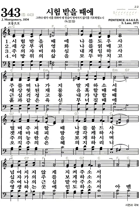 새찬송가 악보: 343장 시험 받을 때에(고화질/가사)