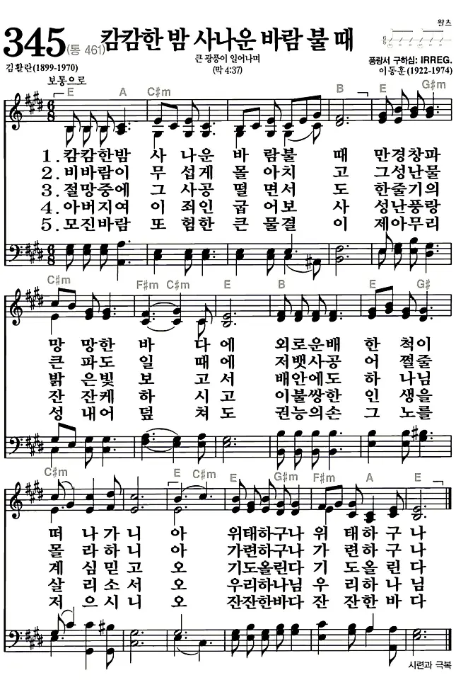 새찬송가 악보: 345장 캄캄한 밤 사나운 바람 불 때(고화질/가사)