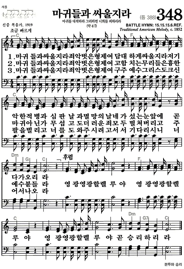 새찬송가 악보: 348장 마귀들과 싸울지라(고화질/가사)