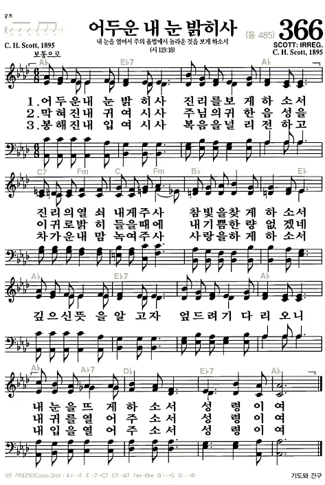 새찬송가 악보: 366장 어두운 내 눈 밝히사(고화질/가사)