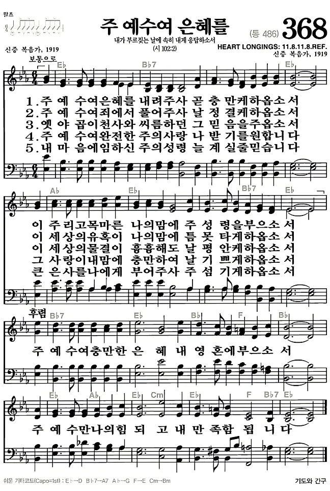 새찬송가 악보: 368장 주 예수여 은혜를 내려주사(고화질/가사)