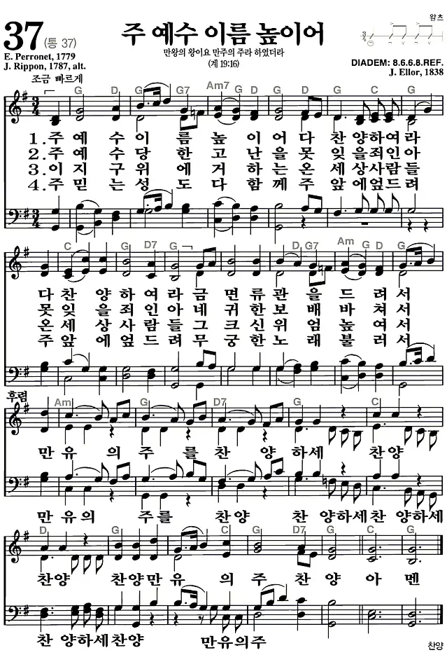새찬송가 악보: 37장 주 예수 이름 높이어(고화질/가사)