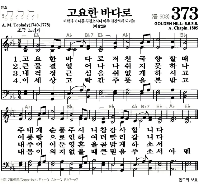 새찬송가 악보: 373장 고요한 바다로(고화질/가사)