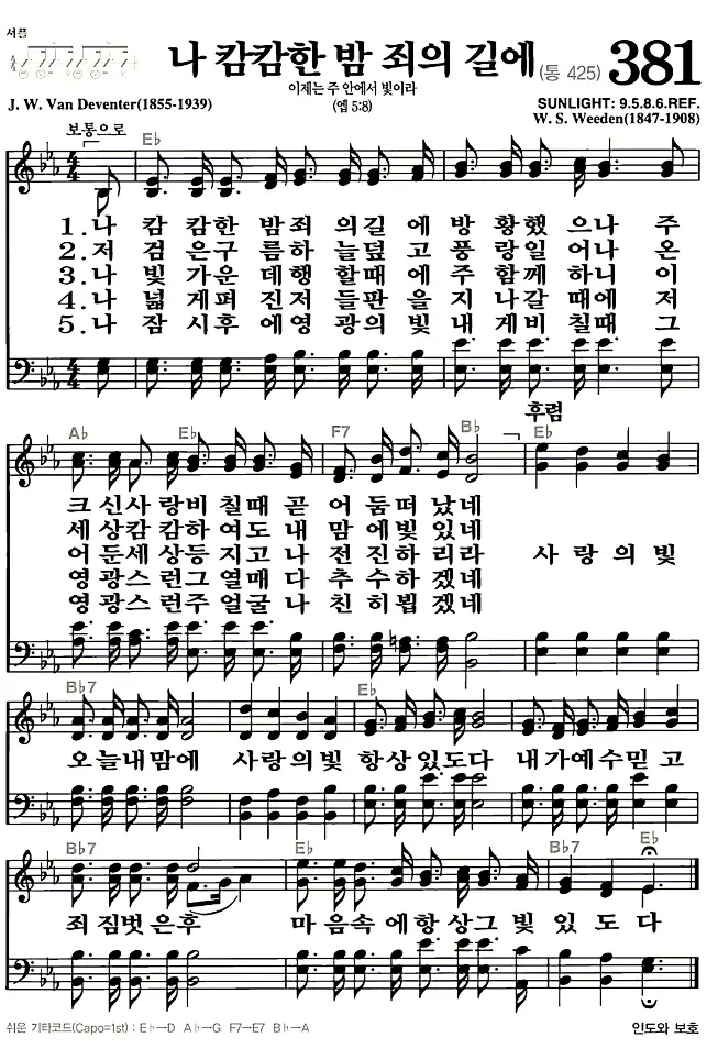 새찬송가 악보: 381장 나 캄캄한 밤 죄의 길에(고화질/가사)