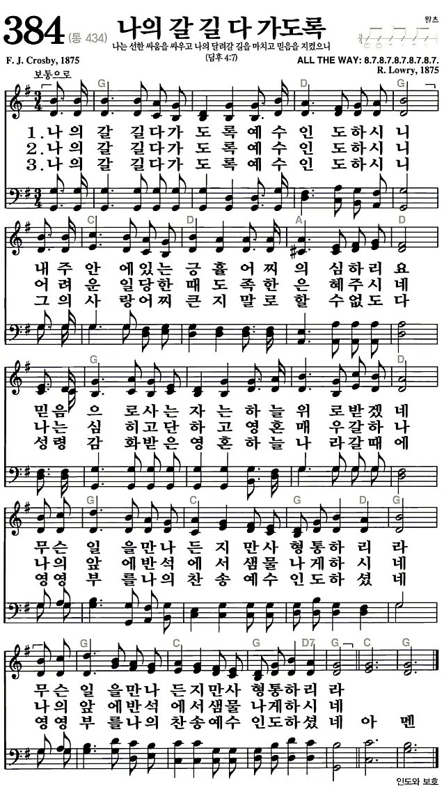 새찬송가 384장 나의 갈길 다 가도록의 고화질로 스캔된 새찬송가 악보입니다.