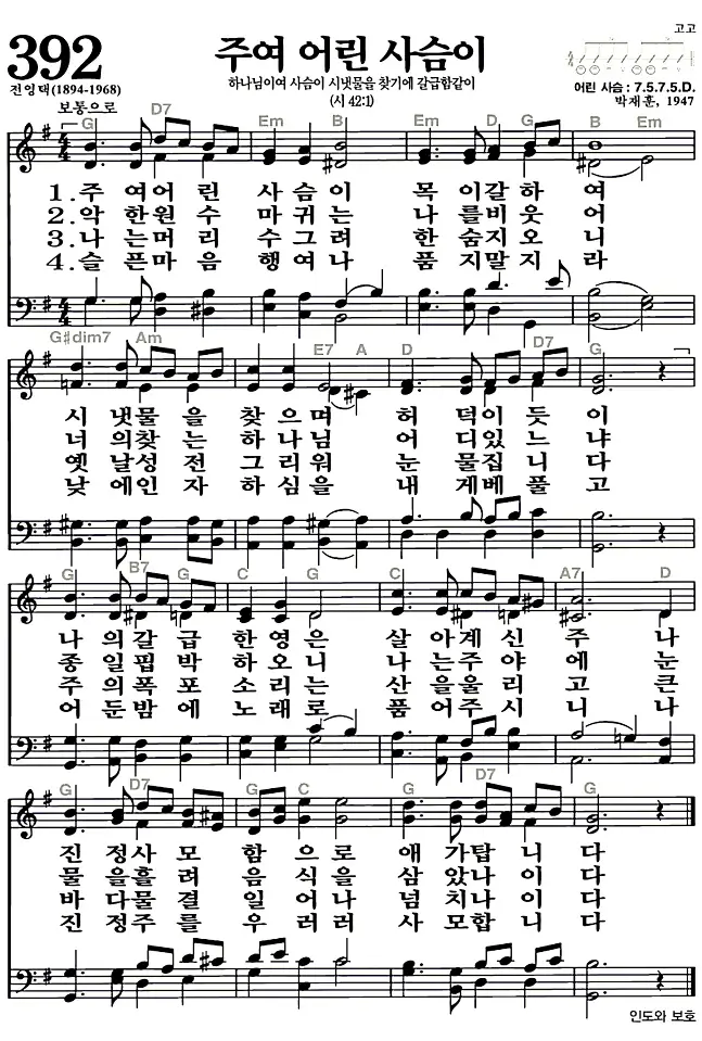 새찬송가 악보: 392장 주여 어린 사슴이(고화질/가사)